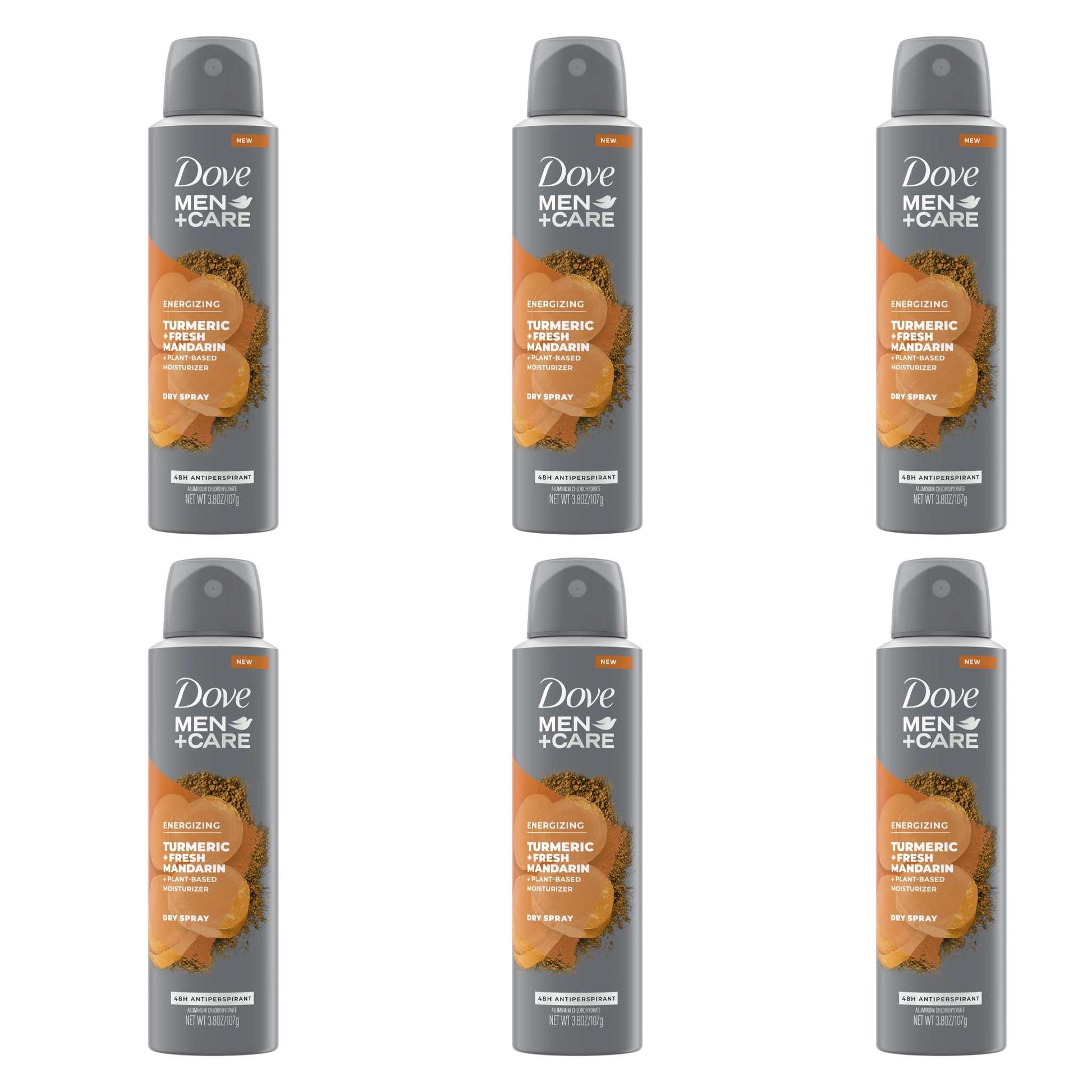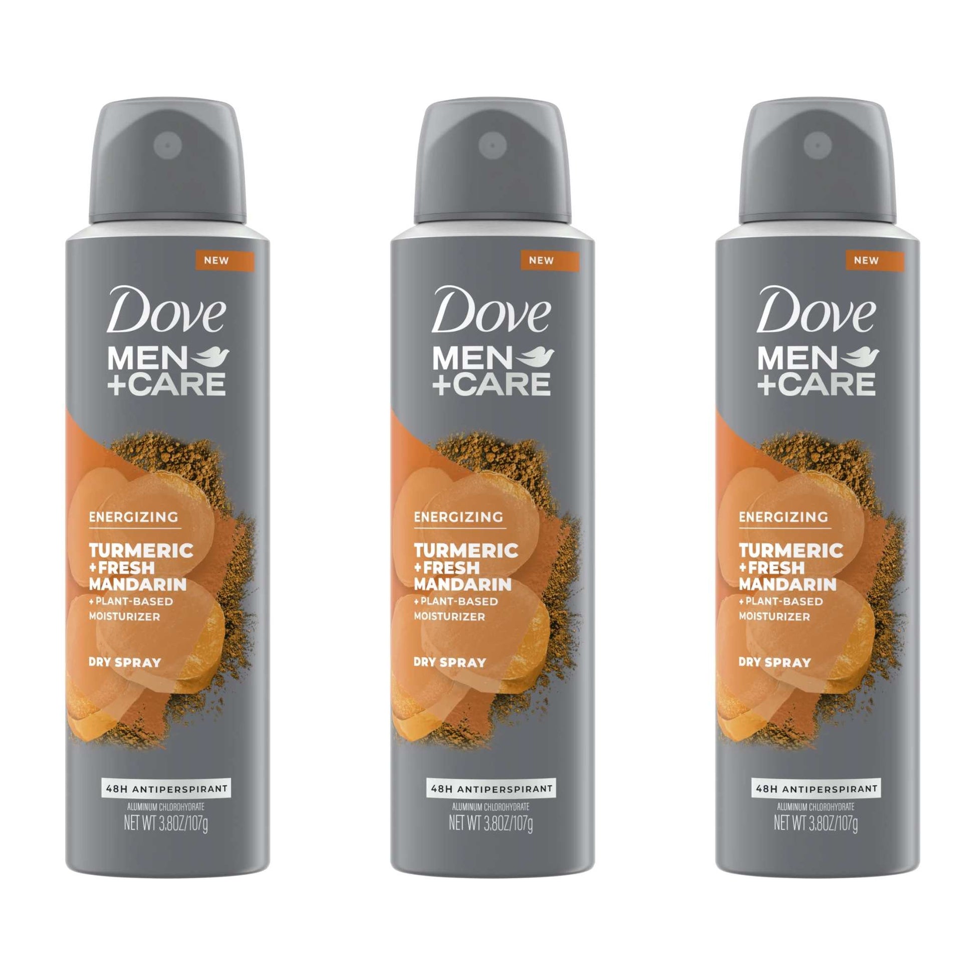 - Model name : Antiperspirant Dry Spray Deodorant for Men Turmeric and Fresh Mandarin 48 Hour Sweat and Odor Protection hazmat : AEROSOLS scent : Citrus brand : DOVE MEN + CARE product expiration type : Does Not Expire is expiration dated product : True cpsia cautionary statement : no_warning_applicable item form : Dry Spray package level : unit number of items : 3 size : 3.8 Ounce (.
