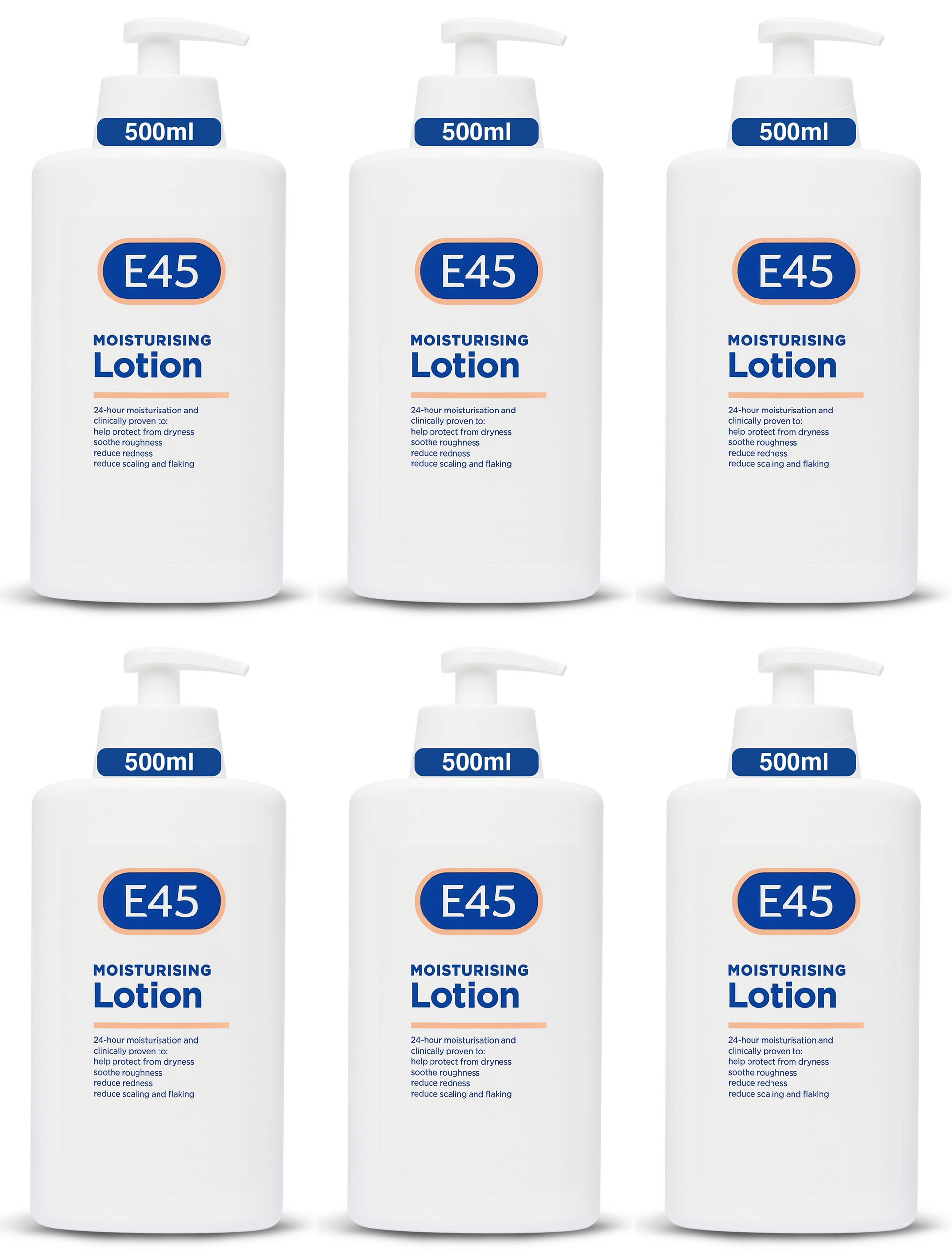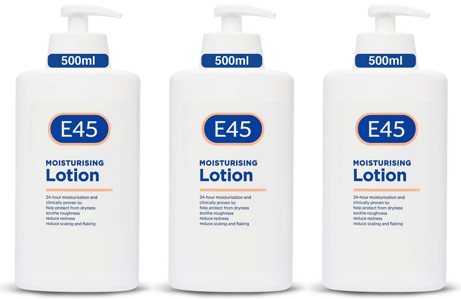 - E45 Dermatological Moisturising Lotion, 500 mL is a gentle, fragrance-free daily moisturiser formulated to soothe and hydrate dry, sensitive skin.